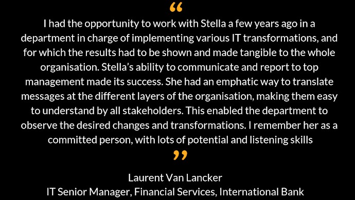 As an Executive Leadership Coach, Trainer and Facilitator, Stella is dedicated to creating environments and cultures that inspire people to become better leaders. Organisations become able to remove the roadblocks that stop their teams from delivering excellence. This leads her to partnering with leading corporations in industries such as Banking & Finance, Legal services, Management Consulting, or Information & Technology.